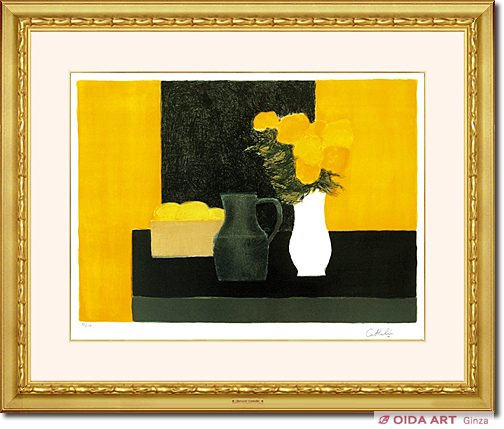 色彩のコントラストを中心としながらも、カトランらしい柔らかい世界を崩さずに描いた作品です。鮮やかな黄色と黒の対比が目に飛び込み、花瓶の白さが画面を引締めるアクセントを生み出しています。