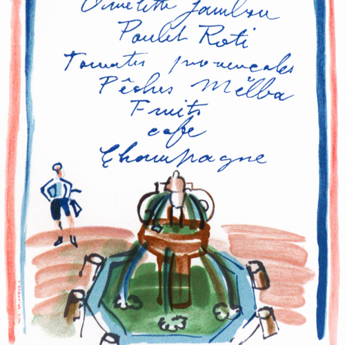 「リベラシオンのメニュー」は、1944年8月23日第二次世界大戦におけるパリの開放が行われたというニュースを聞き、ドルジュレス夫人によるささやかな祝いのディナーを、デュフィが一流レストランのメニューさながらに描きあげたものです。“フォア・グラ、ハムのオムレツ、ロースト・チキン、シャンパン”などの料理が記され、リベラシオン(自由)の喜びを表現しています。