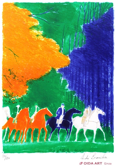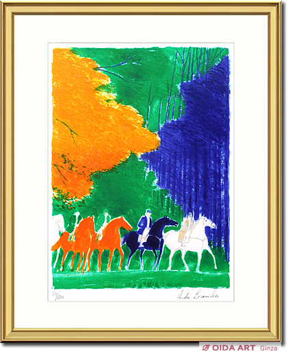 秋色に色づいた木々の間を駆ける騎馬。豊潤な色彩が美しい優雅な作品です。