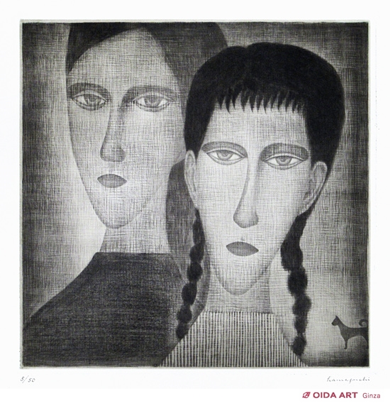 浜口の描く女性像は一見無表情にも感じるが、大きく開かれた目は強い力でこちらに何かを語りかけてくるよう。静寂の中に女性の中に秘める生命力の感じられる作品です。