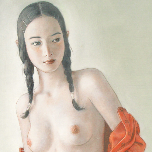 美人画・裸婦で絶大な人気を誇った高塚省吾。1957年より小津安二郎監督映画のタイトルを担当するなど多方面で活躍しました。柔らかな女性の肌とセーターの質感が感じられる美しい作品です。