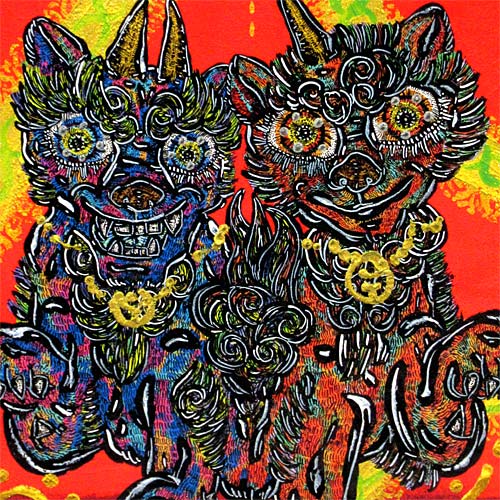 二体の狛犬が描かれた作品。版画ながら存在感と立体感を感じる作品です。