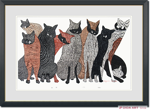 斎藤清の代表的なモチーフである猫の作品。版木の木目を生かした猫の柄、密集した猫の造形と空間を木版画の魅力充分に見事に表現した名品です。