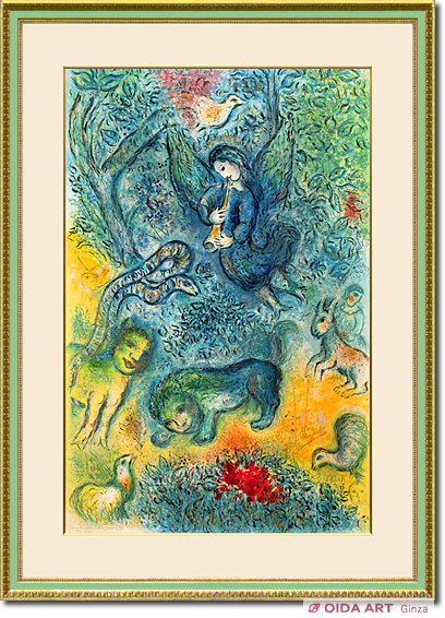 シャガールが舞台装置と衣装を担当して行われた、オペラ座でのモーツァルト『魔笛』の初演のために制作された作品。画面全体に散りばめられた宝石のように華やかな色彩が美しく、貴重なオリジナルサイン入りの作品です。