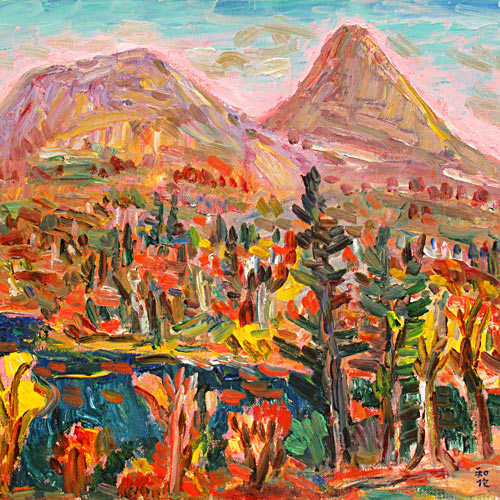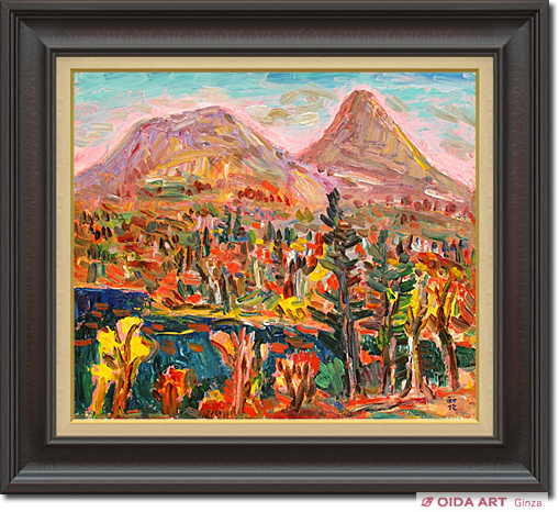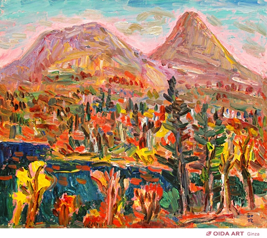 明るい色調で描く風景画を主とし、美の構図にこだわり求め続けた小林和作。澄み渡る空に映える、鮮やかな紅や黄色に染まった広大な風景に、秋の訪れを感じさせる作品です。