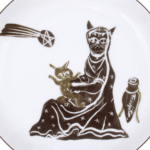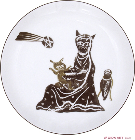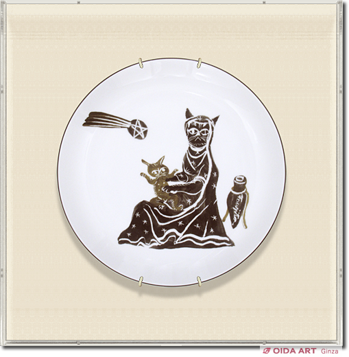 猫の「聖母子」が描かれた飾絵皿で、底面に「Kimiyo Foujita & SPDA Tokyo 2008」と印字されています。