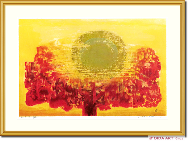 輝く夕日と光をあびて燃えるように真っ赤になった木に、自然の持つ生命力を感じるとても力強い作品です。