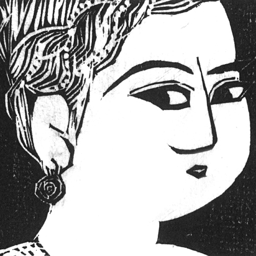 棟方志功は江戸浮世絵の美人画「大首絵」に興味を持ち、1956年の作品「鍵板画柵」以来、多くの女性画作品を制作しています。女性の流した目線が印象的な、妖艶な雰囲気を持った作品です。