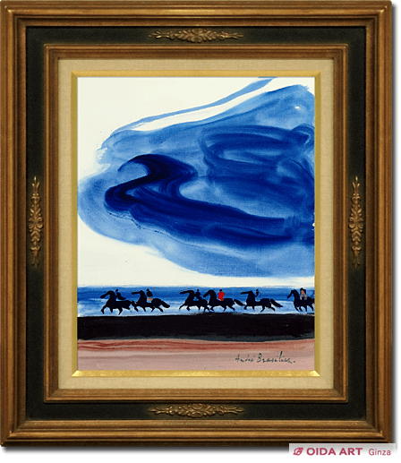青い雲の流れるような形と海岸を駆ける馬のシルエットがブラジリエらしく、シンプルで落ち着いた色彩の中にもドラマを感じる作品です。