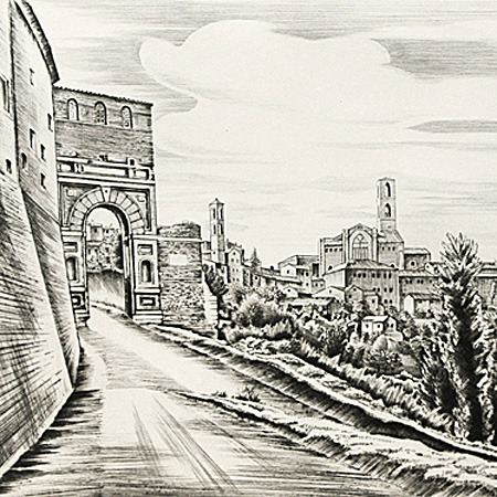 15世紀に建てられたサン・ジローラモ修道院へ通じる門の風景。修道院の重厚な建築と大きく取った空の対比が印象的です。