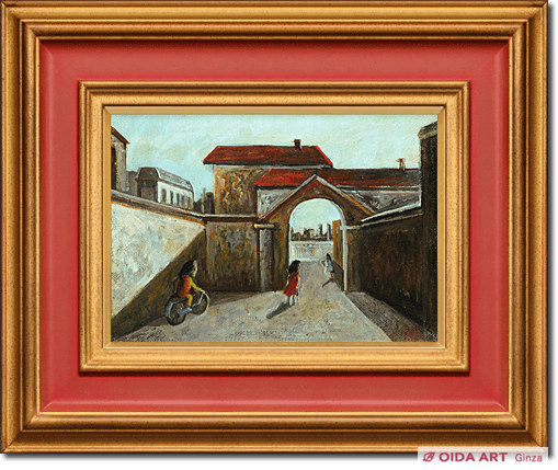 遠藤彰子独特の暗緑色を配した通りを描いた作品。描かれている人々は背を向け表情が伺えず、どこか暗さや寂しさを感じさせます。