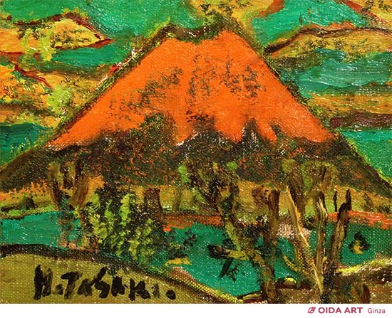 朱色の富士と明るく黄緑色に描かれた空が印象的で、小ぶりながら田崎らしい雄大な富士の描かれた作品です