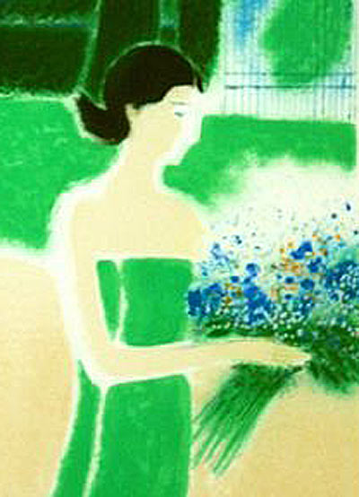 爽やかな色彩で描かれた花束の、細やかな表情が美しい作品です。