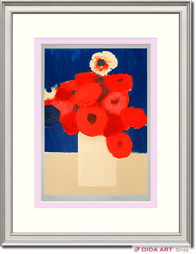 鮮やかな色彩と巧みな構成で描かれた花の作品。大胆な色使いながらも、静かで落ち着いた世界感を表現しています。