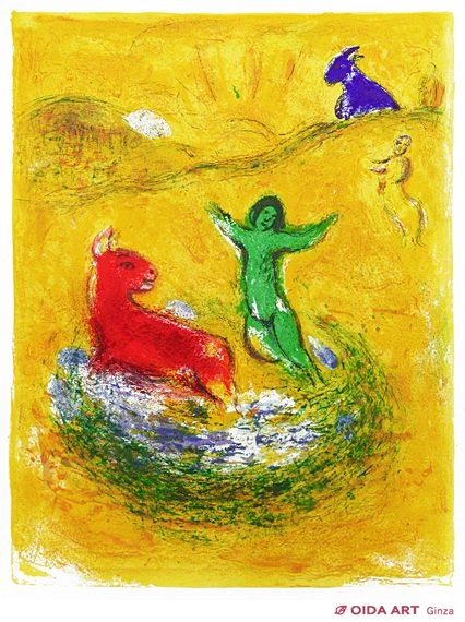 シャガールが古代ギリシアの純愛小説「ダフニスとクロエ」をもとに制作したリトグラフ集の中の名品。シャガールの「ダフニスとクロエ」は、世界的にも挿画本の最高傑作として大変に有名な作品です。